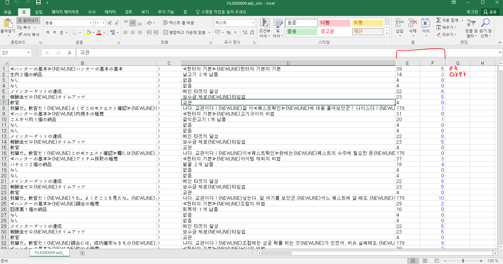 Q.{NEWLINE}이 너무 불편해요 D열을 선택후 '찾기 및 바꾸기'로 {NEWLINE}을 (Ctrl-J)로 바꾸기해서 줄바꿈으로 바꾸고 나중에 (Ctrl-J)를 {NEWLINE}으로 바꾸기해서 되돌리면 되지 않나요? 그후 셀서식에서 텍스트 줄바꿈을 선택하면 줄 바꿈도 깔끔하게 표시되구요