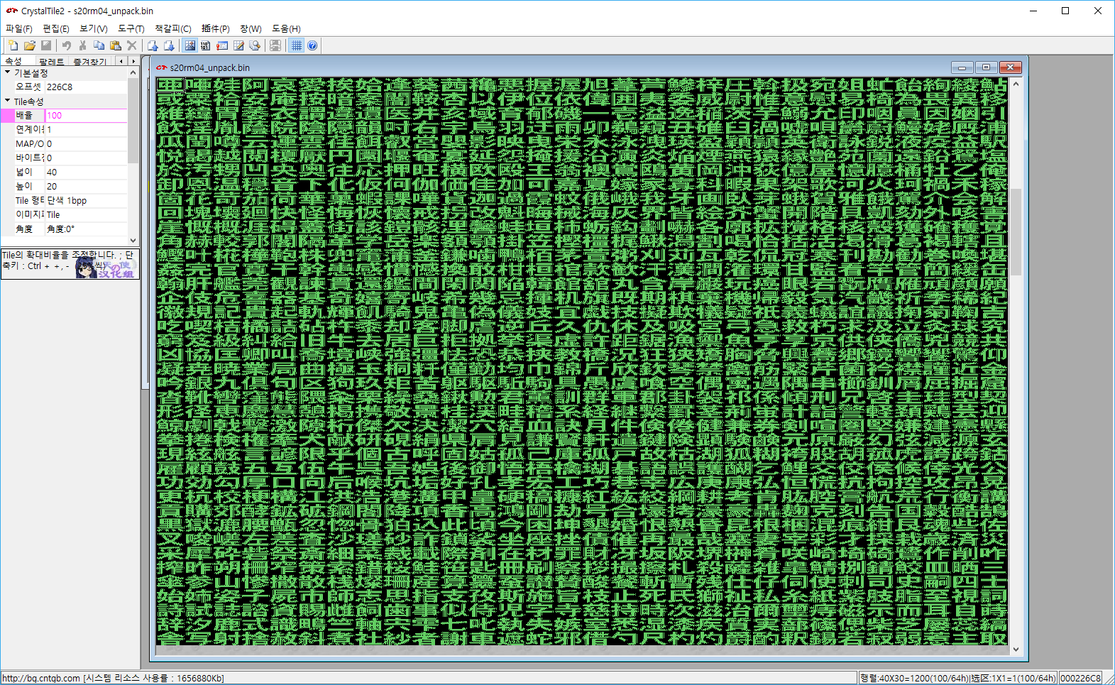 이걸 크리스트타일로 열고 넓이 40 높이 20 Tile 단색 1bpp로 두면 한자가 보일것이다.