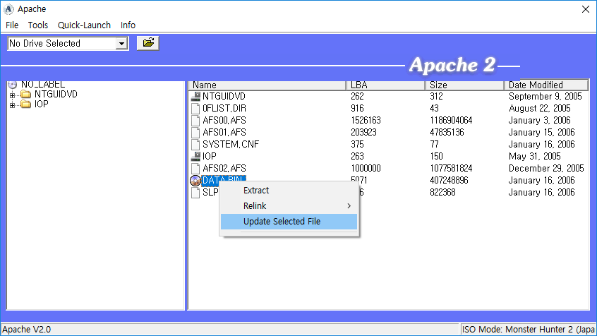 DATA.bin까지 리빌드를 하고 ISO를 리빌드하는대신 원래 DATA.bin이랑 크기를 맞춰주고 Apace 2.0으로 바꿔치는 방식을 사용한다
