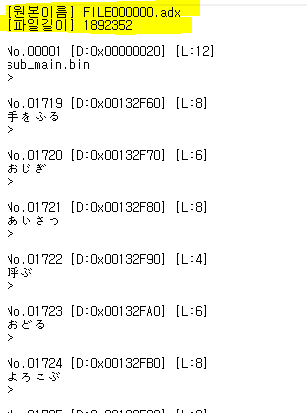 실제로 이렇게 추출하면, 대사가 아닌 쓰레기값이 섞이거나 바이트가 밀리거나. 혹은 일부 대사는 추출이 되지 않거나 할텐데 대부분 노가다로 맞춰두긴 했다.
