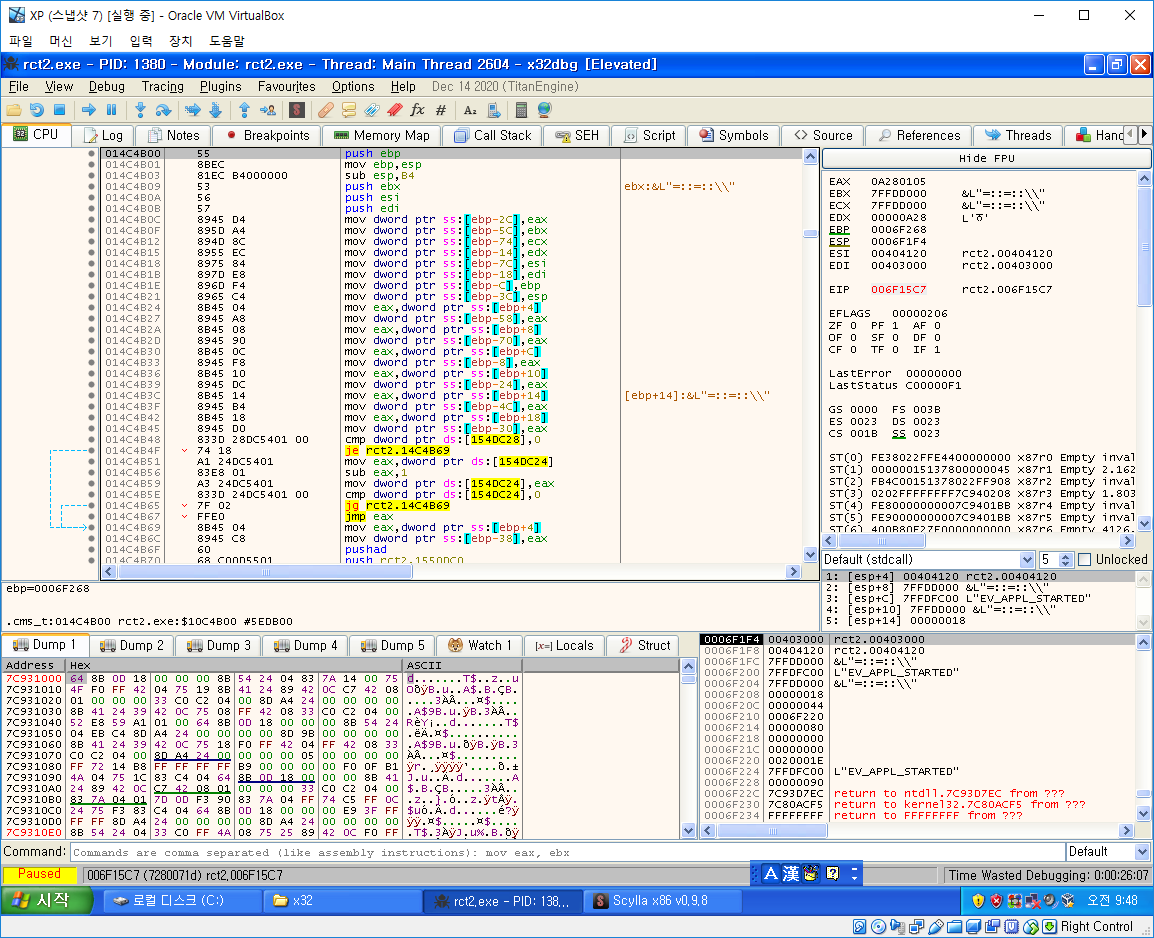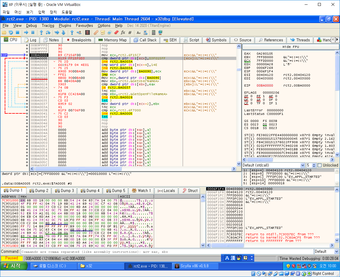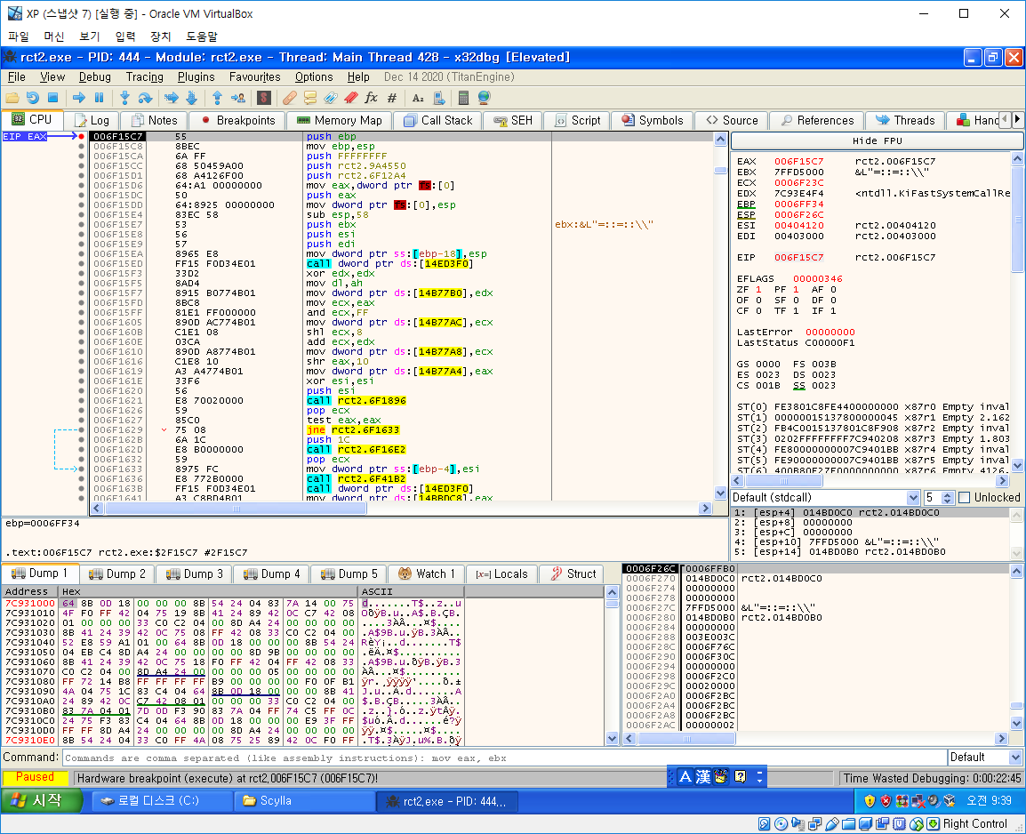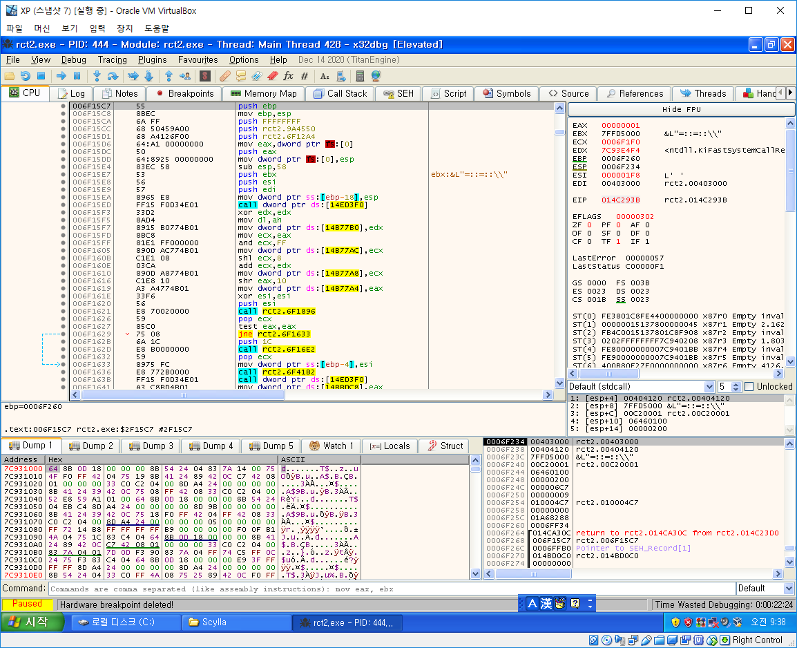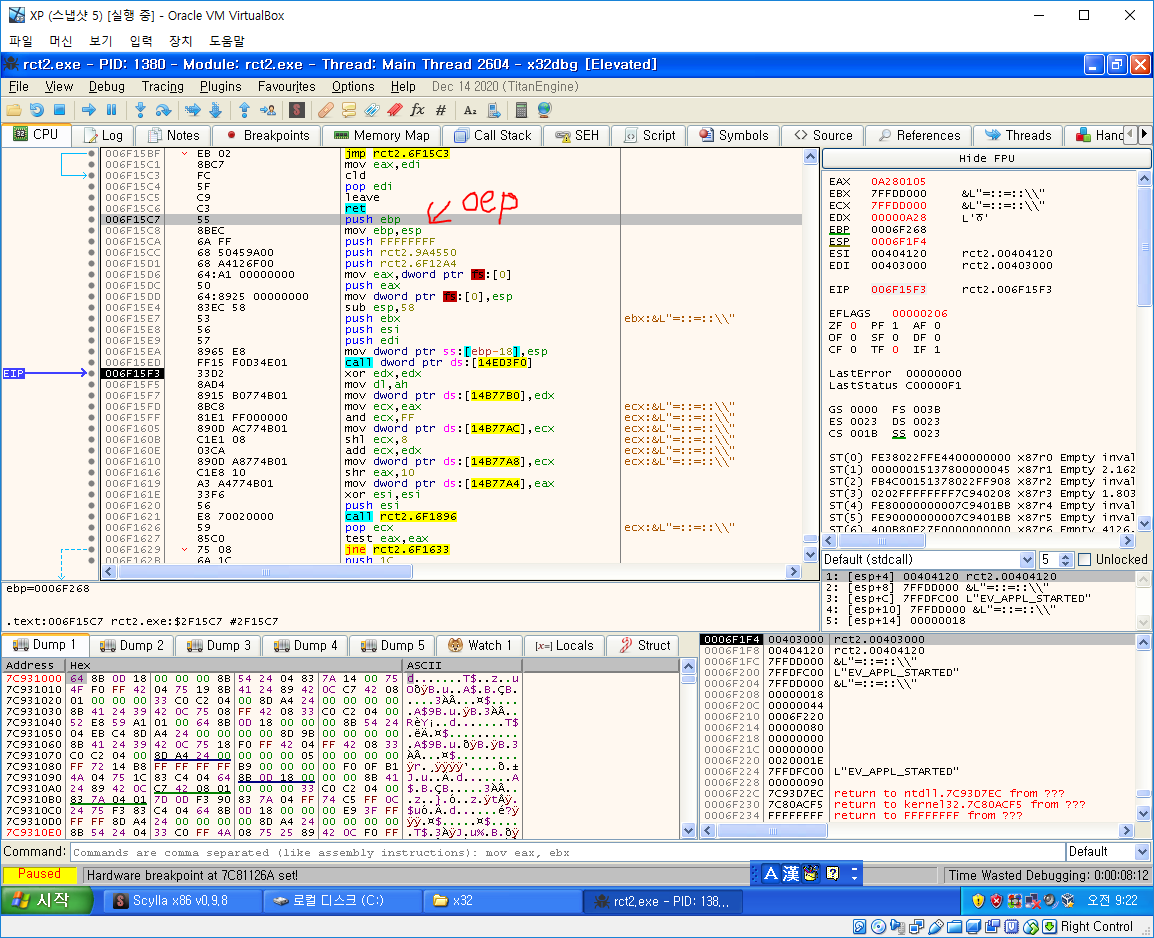 그다음은 OEP를 찾아야 하는데 일반적으로 OEP를 찾는 방법은 ESP Trick이나