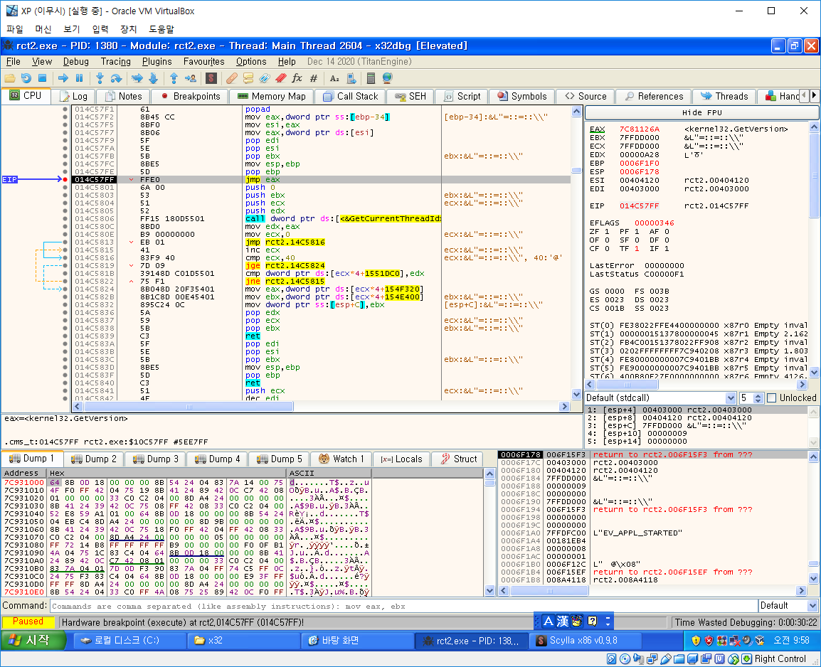jmp eax라는 곳에서 멈추면 EAX 값에 GetVersion이라는 함수의 주소가 들어있고 이를 jmp eax를 통해 호출함을 알 수 있다.