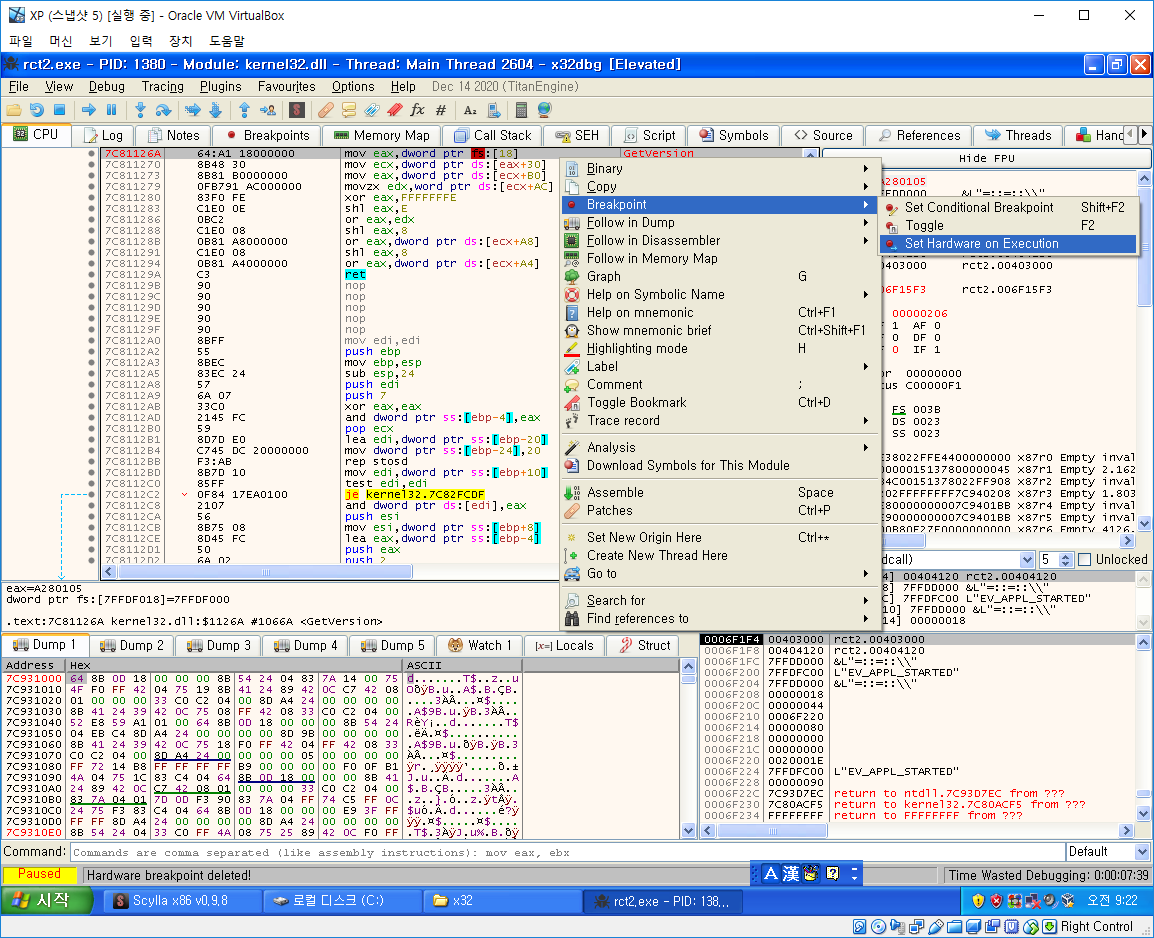 Ctrl+G를 누르고 GetVersion에 HW(하드웨어) BP를 건다.
