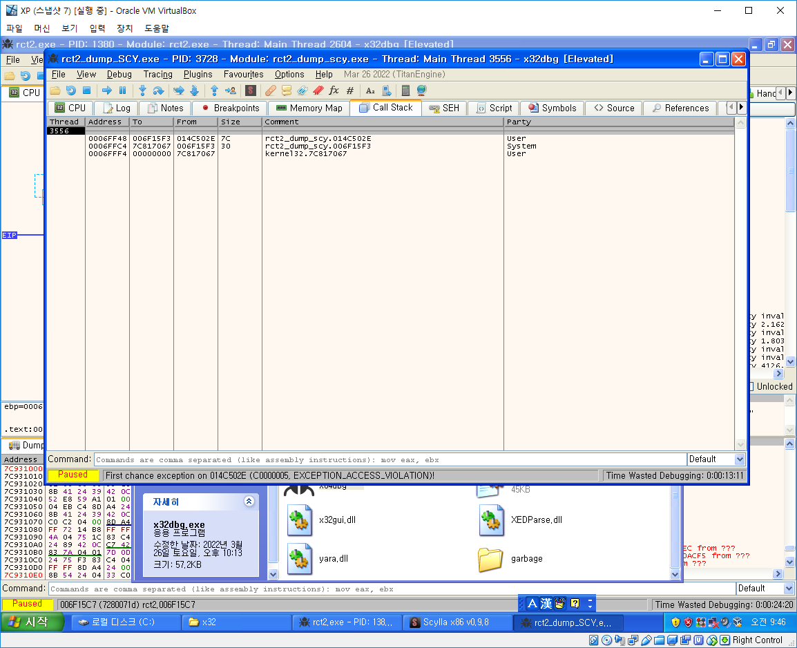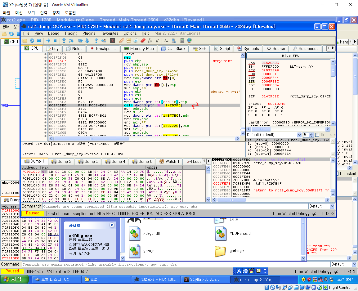 언팩된 파일을 olly에 올려보자 여기서 Exception이 발생한다.