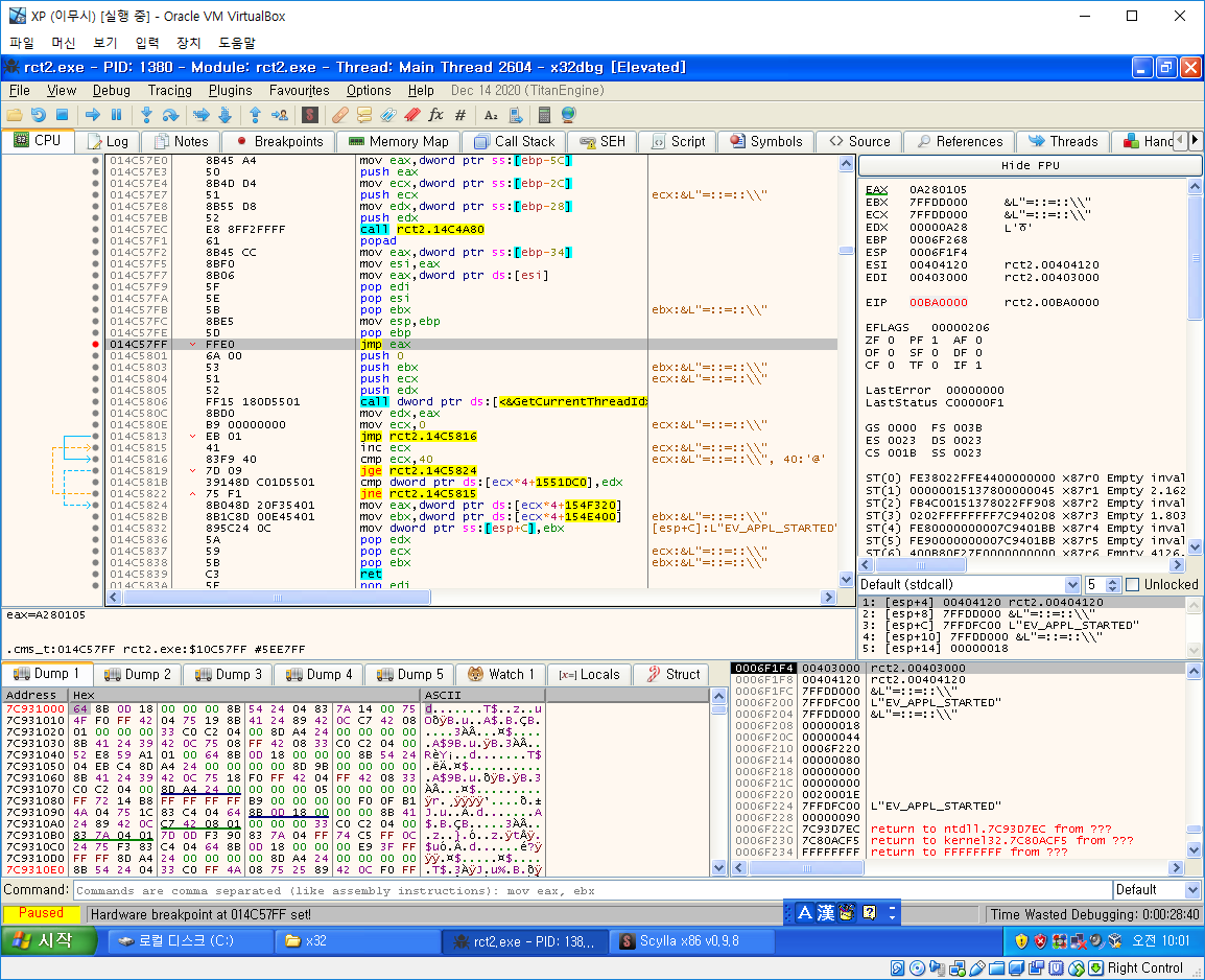 그리고 다 작성했다면 아까 확인했다 eax에 위치에 HW BP를 걸고