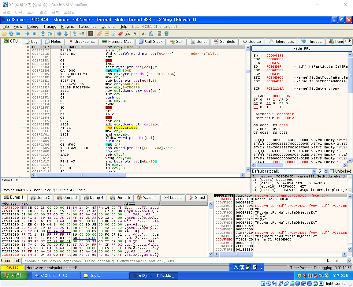 만약 우리가 봤던 모습이다하면 여기에 HW BP걸고 F9를 걸면 OEP에 도달하게 된다.